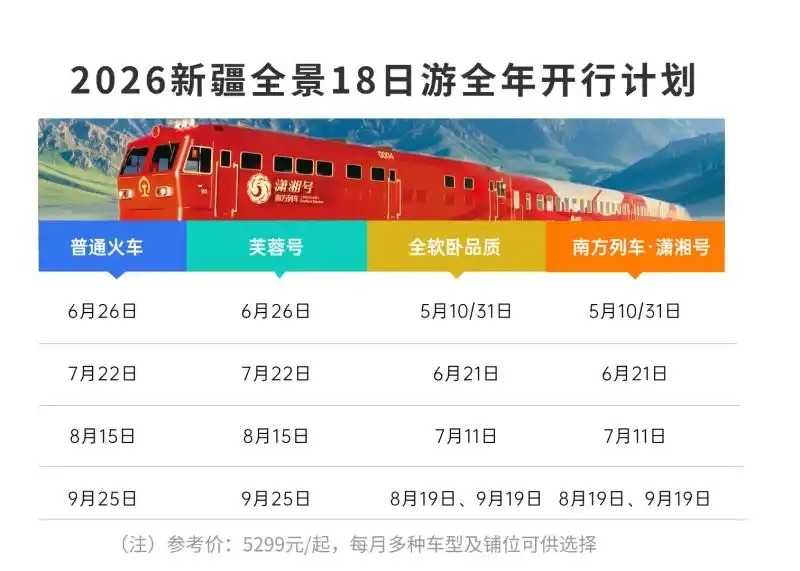 新疆南北疆全景18日游·全年开行缱绻天山南北,四季皆景。2026年,潇湘号、芙蓉号、全软卧专列、世俗绿皮火车四款车型同步开行,得志不同预算与出行需求。不管您追求虚耗、隆重实惠,还是偏疼怀旧火食气,总有一款安妥您。全年团期:5月10日、31日,6月21日,7月11日,8月19日,9月19日价钱参考:5299元/起(芙蓉号硬卧),多种车型及铺位可供选拔简要行程:第一站:兰州,看黄河第一桥,打卡水墨丹霞。第二站:哈密,听十二木卡姆,穿越大海谈妖怪城。第三站:吐鲁番,火焰山下,与《西纪行》来一场时空对话。第四站:乌鲁木王人,登天山天池,看瑶池瑶池。第五站:伊犁,在那拉提草原等风来,在杏花谷看粉白花海与雪山同框。第六站:博州,赛里木湖蓝冰正在苏醒,环湖360°的蔚蓝尽收眼底。第七站:喀什,帕米尔高原白沙湖反照昆仑之巅;走进喀什老城,感受千年古城火食。第八站:莎车,散步老城,穿越回西域三十六国。第九站:库车,穿越独库公路南段,看红色峡谷;夜赏《西域儿子国》歌舞,梦回龟兹。第十站:库尔勒,罗布东谈主村寨里,在塔克拉玛干边际,与千年胡杨对望。即日起不错线上、线下门店同步预订,长沙晚报“一谈阅江山·文旅驿站”(湖南慢悠旅行文化传播有限公司)专科客服解答行程细节。商讨报名:18569532733(玲子),18570381536(小李)。报名地址:长沙晚报一谈阅江山·文旅驿站(晚报大路267号-东门1楼)举报/反映