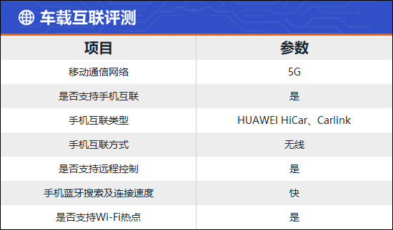 车载互联部分,评测车配备5G集聚,相沿OTA升级、Wi-Fi热门、手机APP而已截止功能。实测来看,手机蓝牙的搜索及指点速率皆很快,平日使用方便快捷。手机互联方面,系统相沿HUAWEI HiCar、Carlink互联花式,并能终了诈欺投屏,智能交互体验出众。