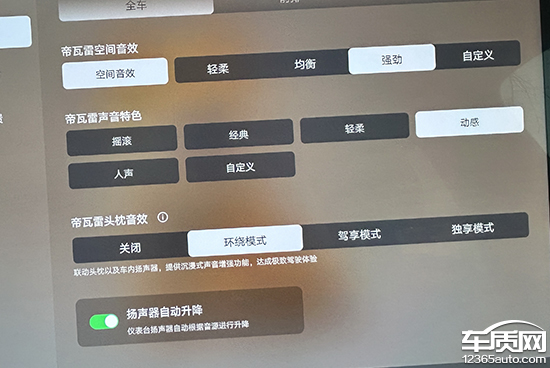 评测车搭载帝瓦雷音响系统,扬声器数目达到26个。不仅硬件树立出色,在软件层面,这套音响系统的可玩性也很高。