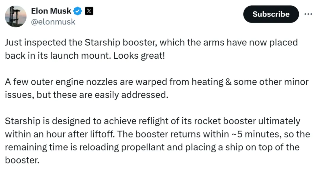 回收得胜后,马斯克暗示,他们刚刚搜检了星舰助推器,臂架一经将它放回辐射架上。