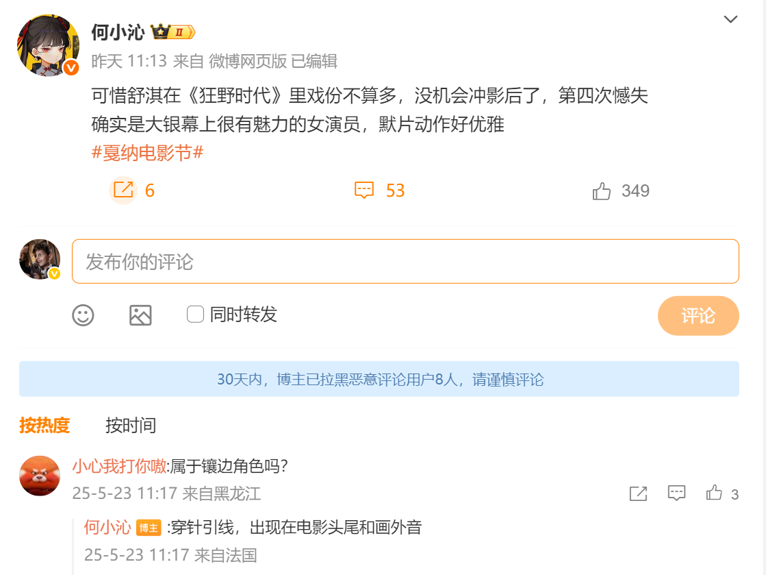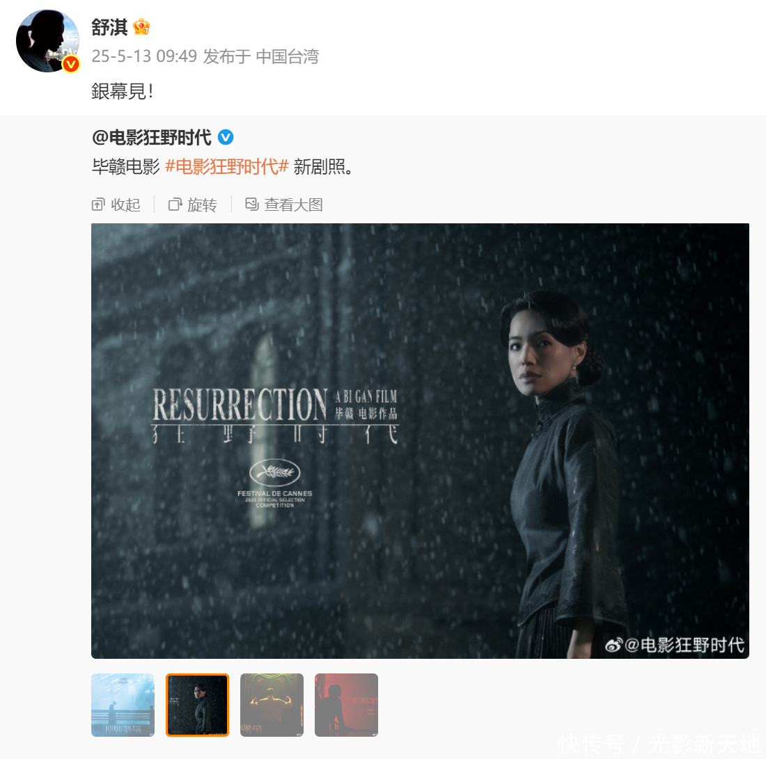 早在去戛纳之前,舒淇转发几张《狂野时间》新剧照,写下“银幕见”三个字,底下有宽阔粉丝喊出“不要接烂片、可贵演员身份、不要亏负侯导的期盼、不要亏负影迷期待”的标语。
