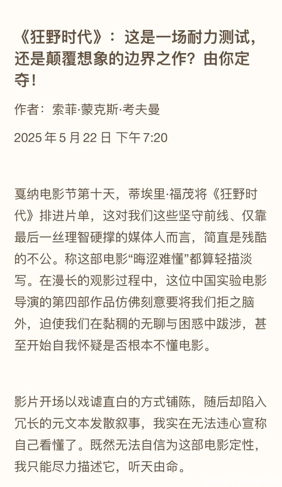 临了,在这里给大家境歉,我昨天看完媒体对《狂野时间》戛纳首映的响应,以为电影口碑会很好(毕竟文艺气质很合电影节的胃口),而一东说念主出演多个形象的易烊千玺,会因为影片本人的好口碑和精妙绝伦的饰演,最猛进程具备夺金棕榈影帝的可能。