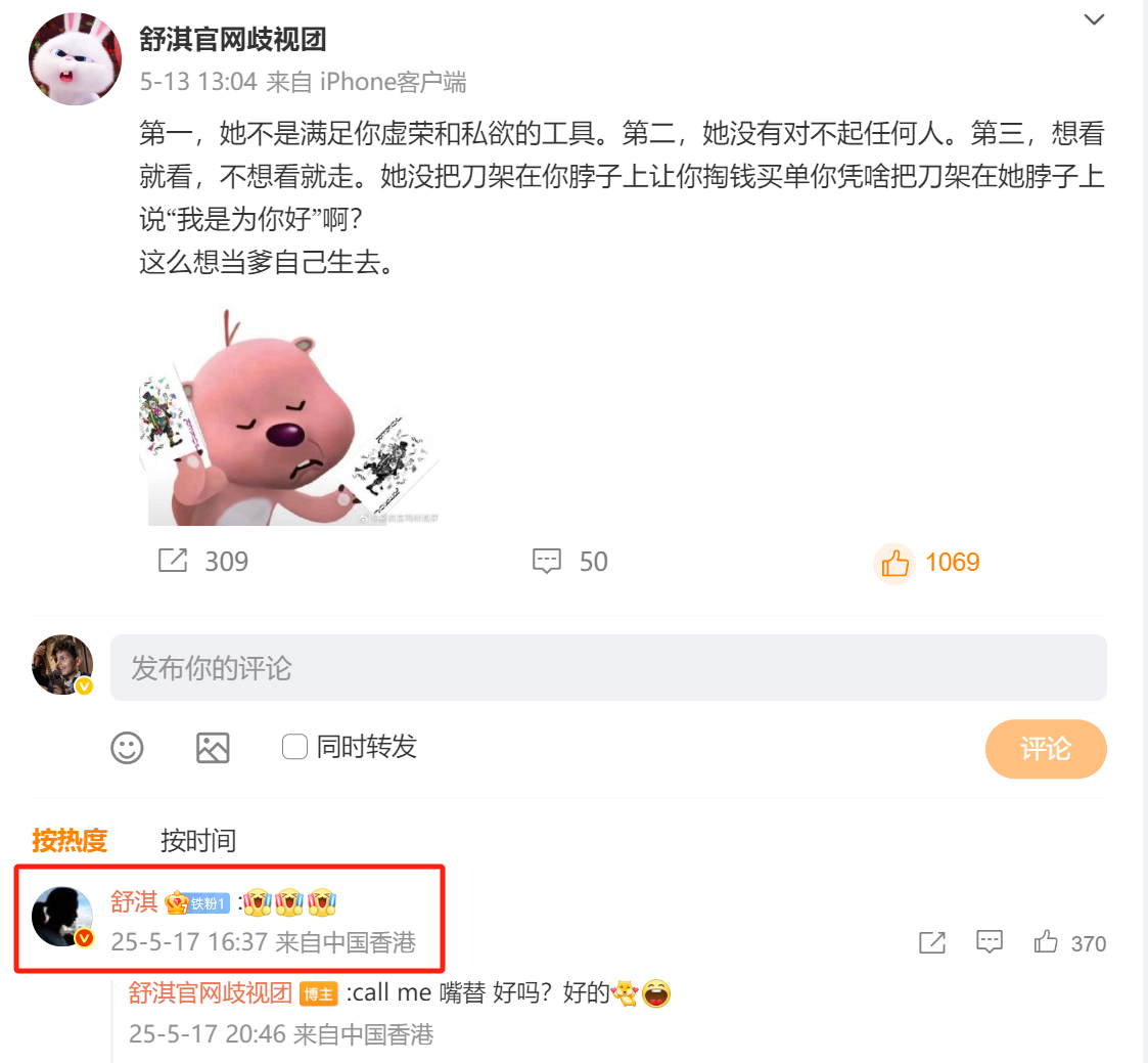 用词相等狞恶、不雅点相等明确,效果舒淇在批驳区发了三个挥舞荧光棒的心理包,默示对这个不雅点的赞同,立场很显着了。