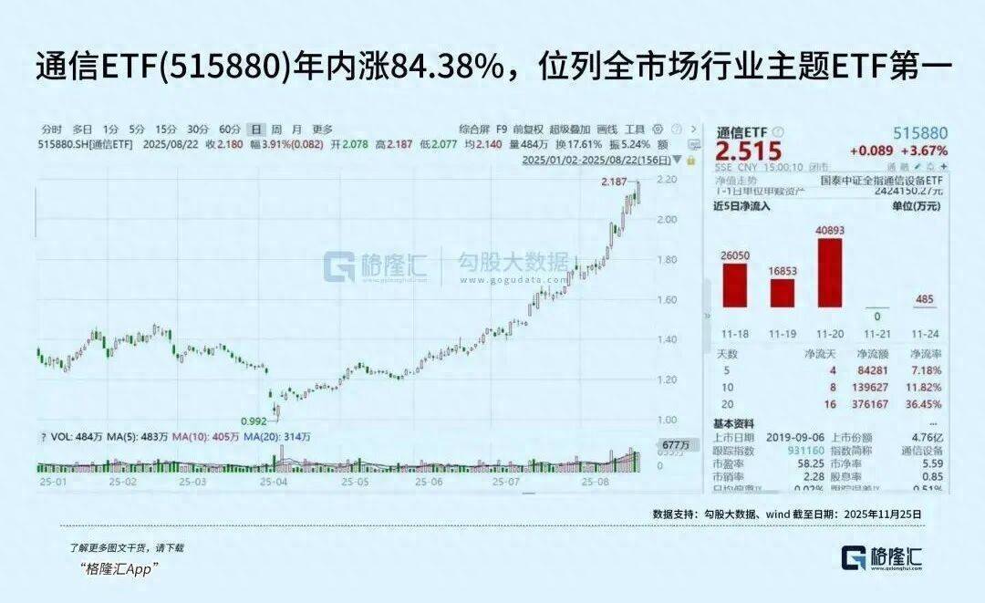 通讯开导、CPO、光纤宗旨等AI硬件主义全天强势,光模块王者追溯,通讯ETF(515880)飞腾3.67%。本年以来,通讯ETF(515880)涨幅达84.38%,位列A股全市集行业主题ETF第一。